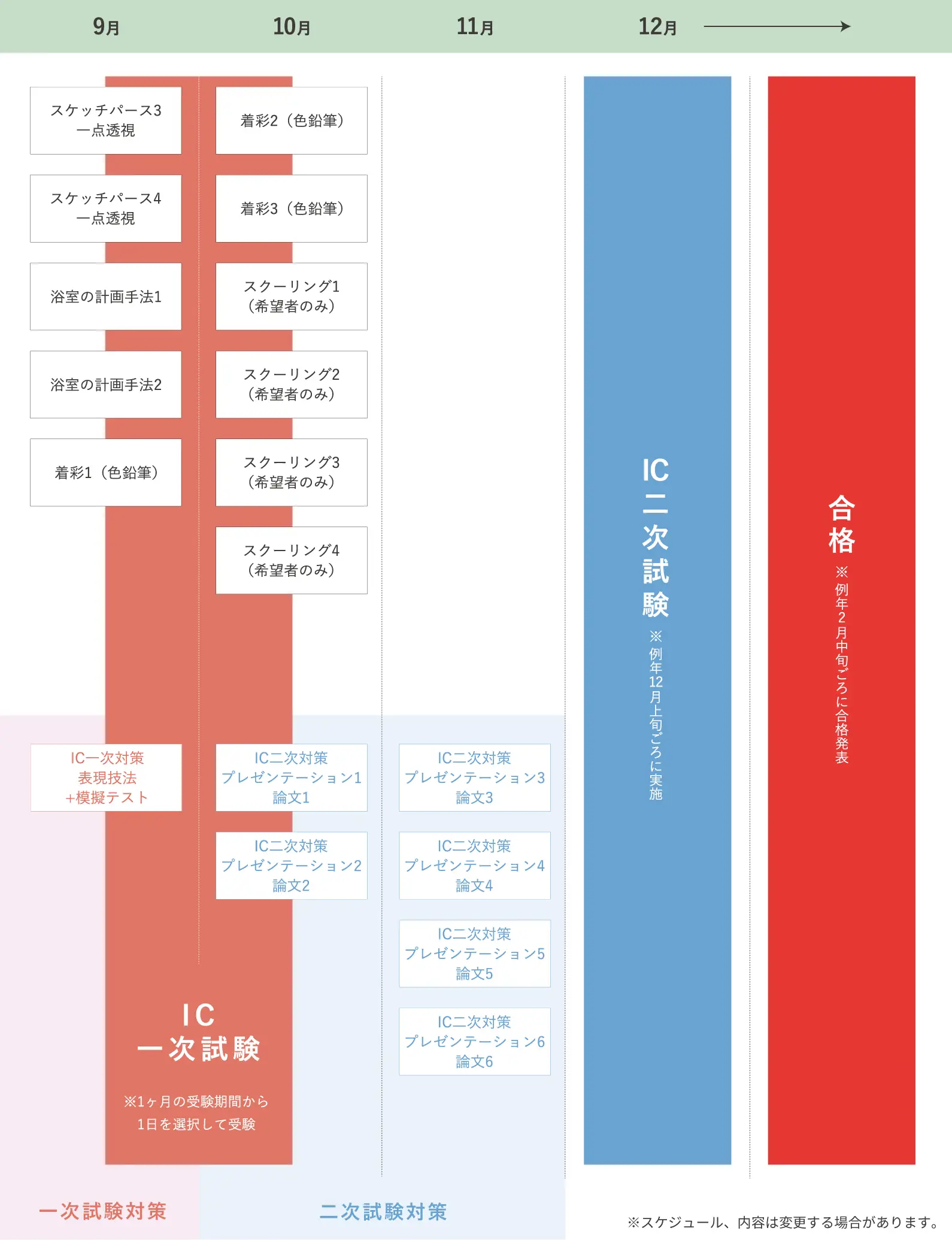 インテリアコーディネーター 二次試験で必要となる図面やパースの描き方、色鉛筆での着彩技術、論文の書き方について対策します。
